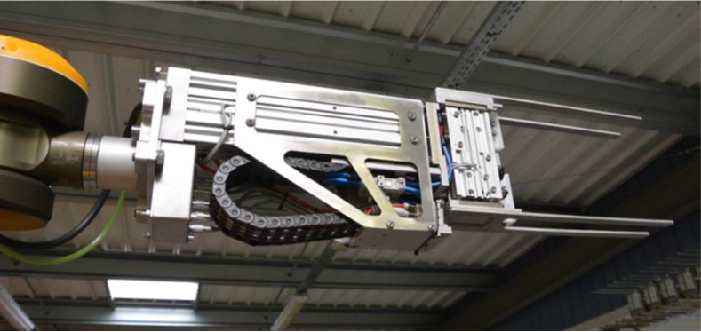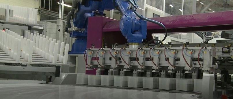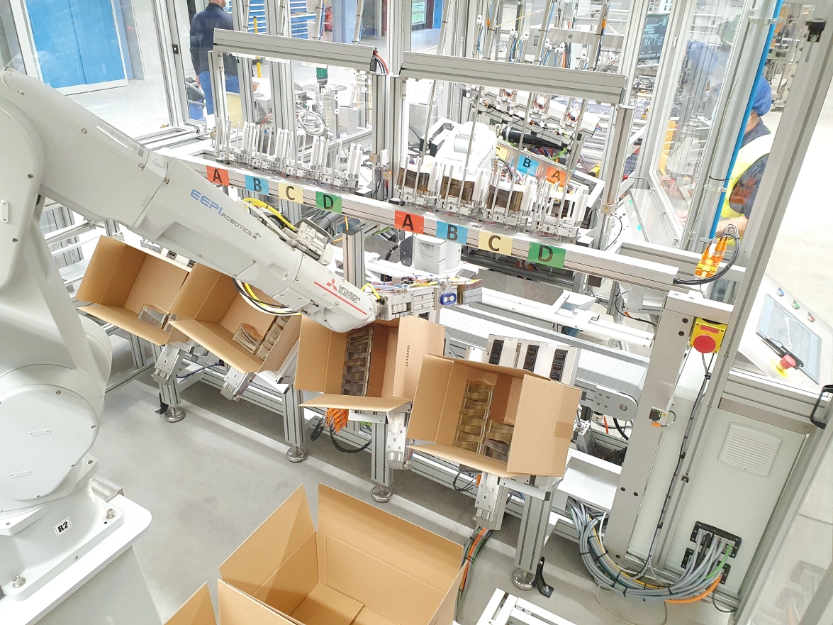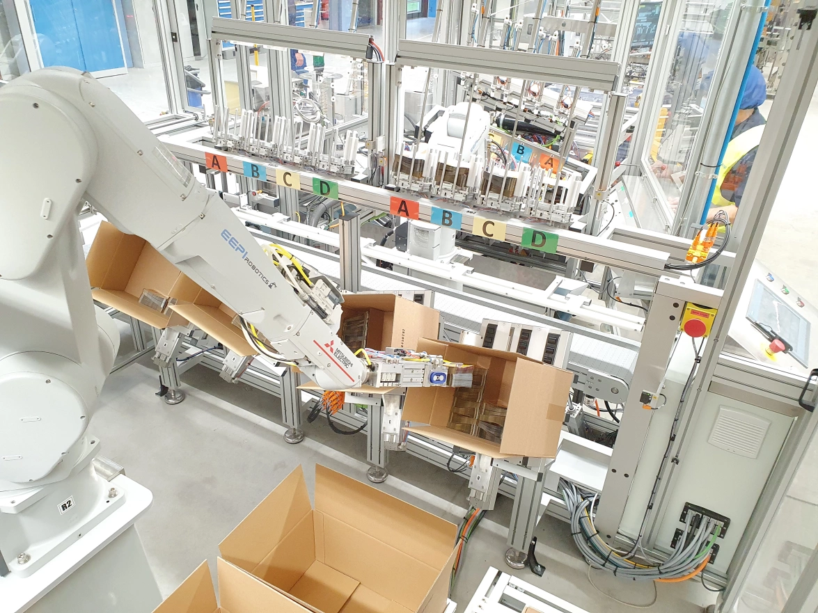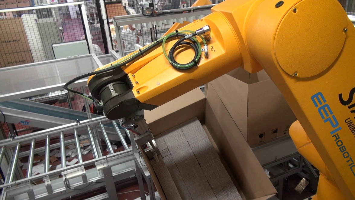 Cette machine spéciale robotisée a pour fonction de charger les coussinets en provenance d’une découpeuse dans des cartons. Elle est capable de manipuler des coussinets de formats différents selon plusieurs paramètres : longueur, largeur, gaufrage et qualité en rapport avec la machine de découpe amont.