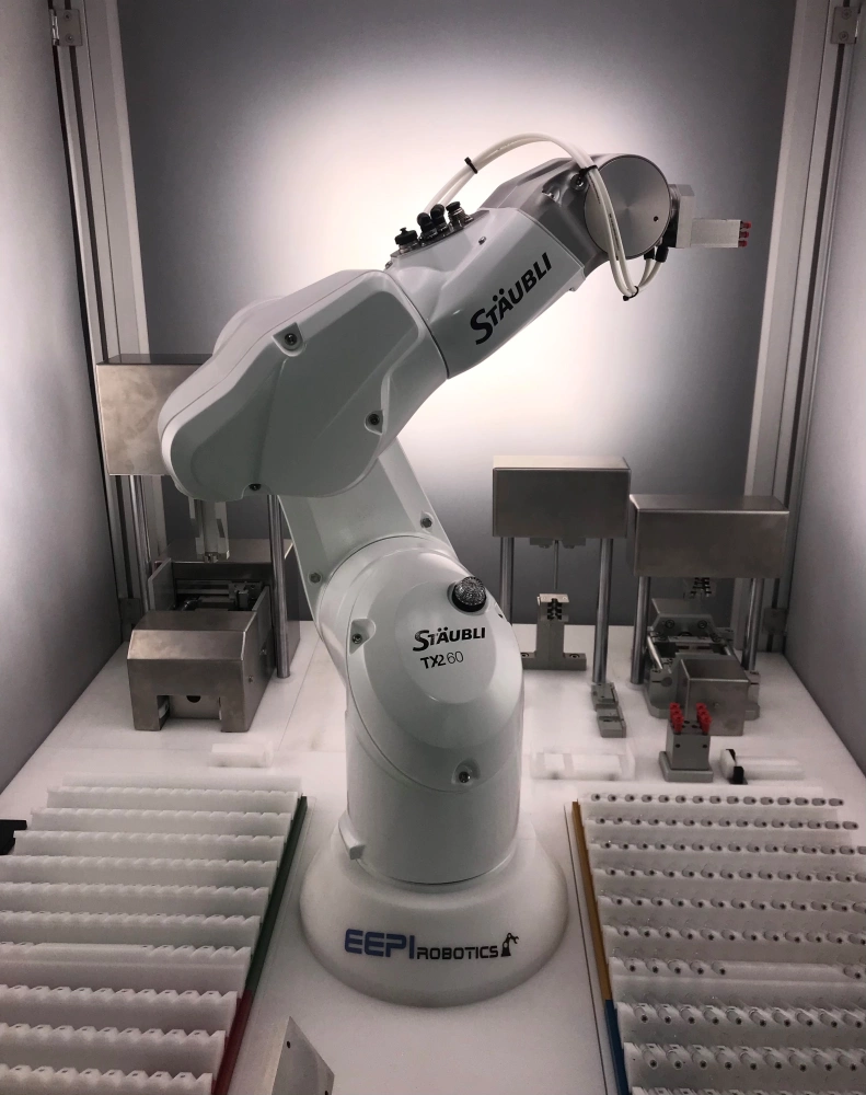 Cette installation en salle blanche a pour fonction de charger des flacons pleins sur des plateaux qui seront amenés vers des lyophilisateurs. Elle est constituée de deux robots aux systèmes de préhension et aux fonctions différents, travaillant conjointement.
