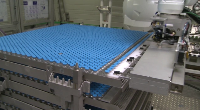 Nous avons conçu cette installation pour charger des flacons de formats variés sur des plateaux, à partir de la remplisseuse, vers un autoclave. Après stérilisation, les flacons sont déchargés de l’autoclave, leur conformité est vérifiée puis les flacons sont palettisés pour distribution.