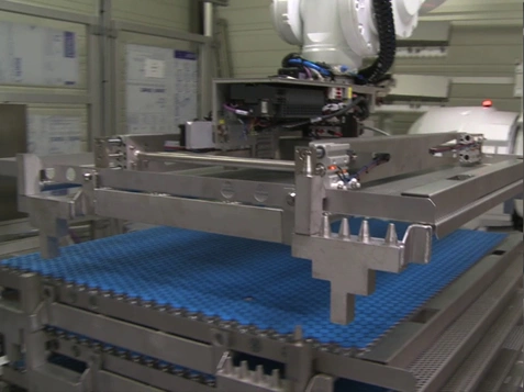 Cette installation a pour fonction de charger des poches sur des plateaux, à partir d’une remplisseuse pour stérilisation. Après stérilisation, elle décharge les poches sur un convoyeur qui les dirige vers la zone de mirage ou de prélèvement. Le système de préhension est complexe et prend en charge plusieurs poches simultanément, y compris à haute température sans les déformer.