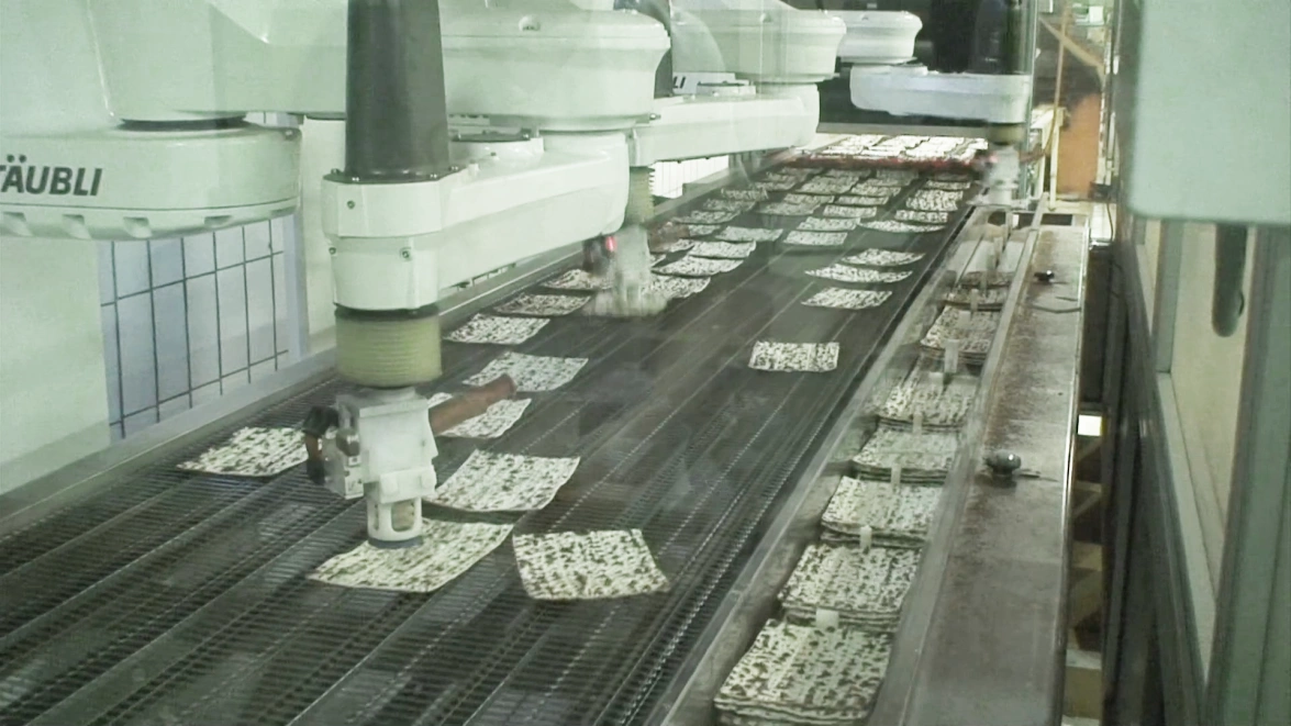 Les pains azyme sont récupérés après leur cuisson sur un convoyeur. L’installation est dotée d’un système de vision et de quatre robots au système de préhension complexe pour empiler les pains azyme à une cadence élevée avant l’emballage des piles dans des sachets plastifiés.