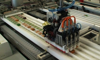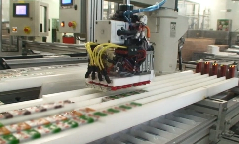 Grâce à son système pouvant manipuler 16 barquettes de fromages en même temps, cette machine spéciale robotisée permet de panacher différents types de barquettes (saveurs variées) et d’alimenter les lignes de conditionnement avec les assortiments finaux.